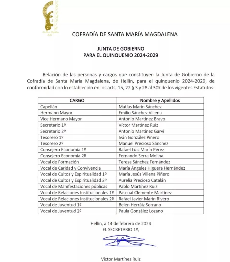 Relación de las personas y cargos que constituyen la Junta de Gobierno de la Cofradia de Santa María Magdalena de Hellín para el quinquenio 2024-2029.